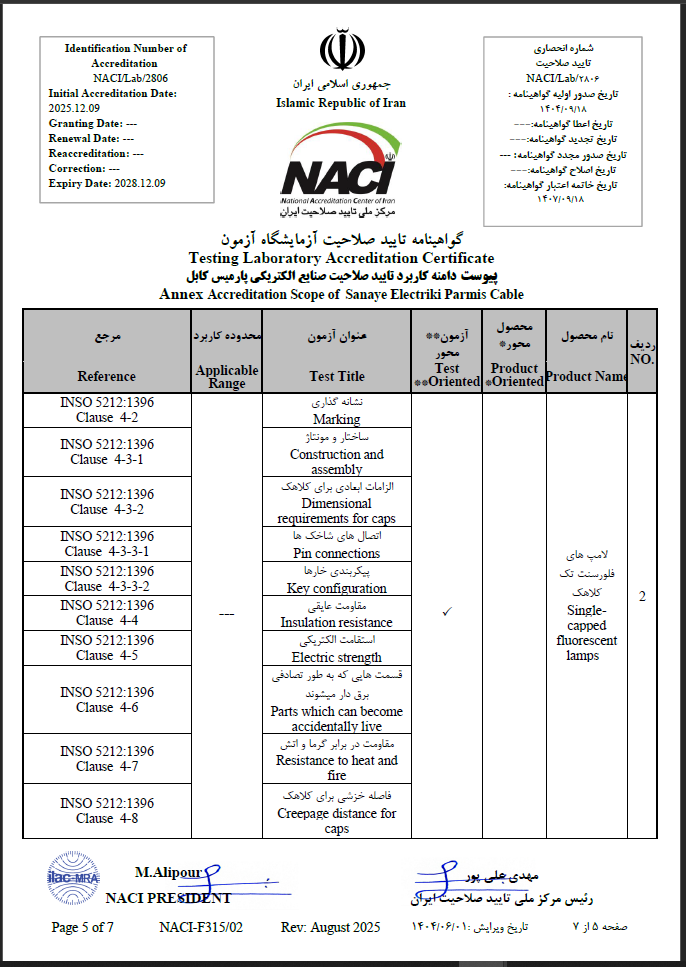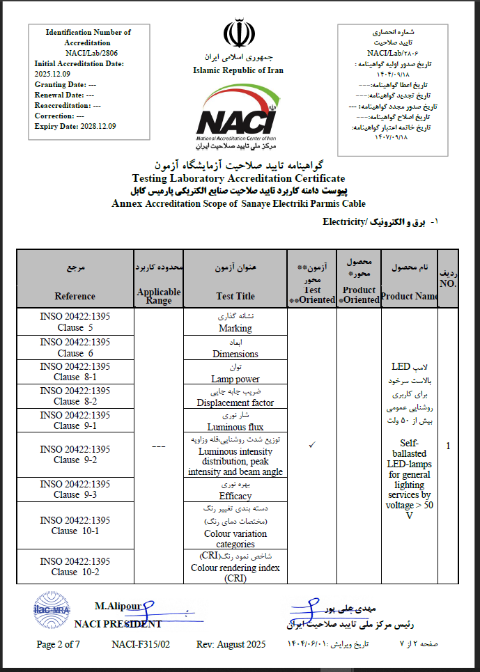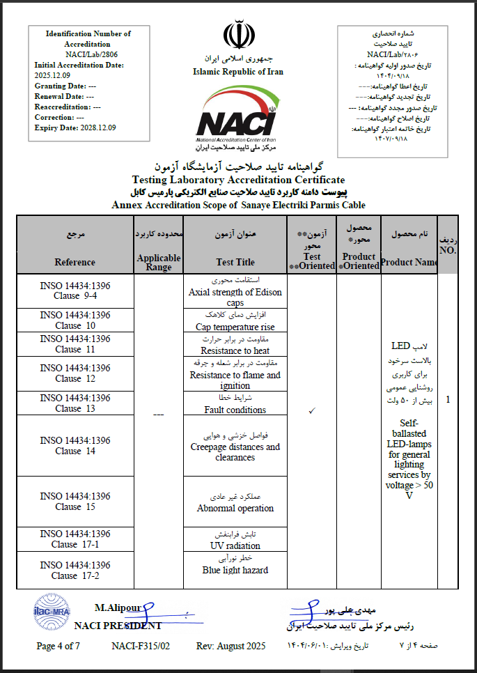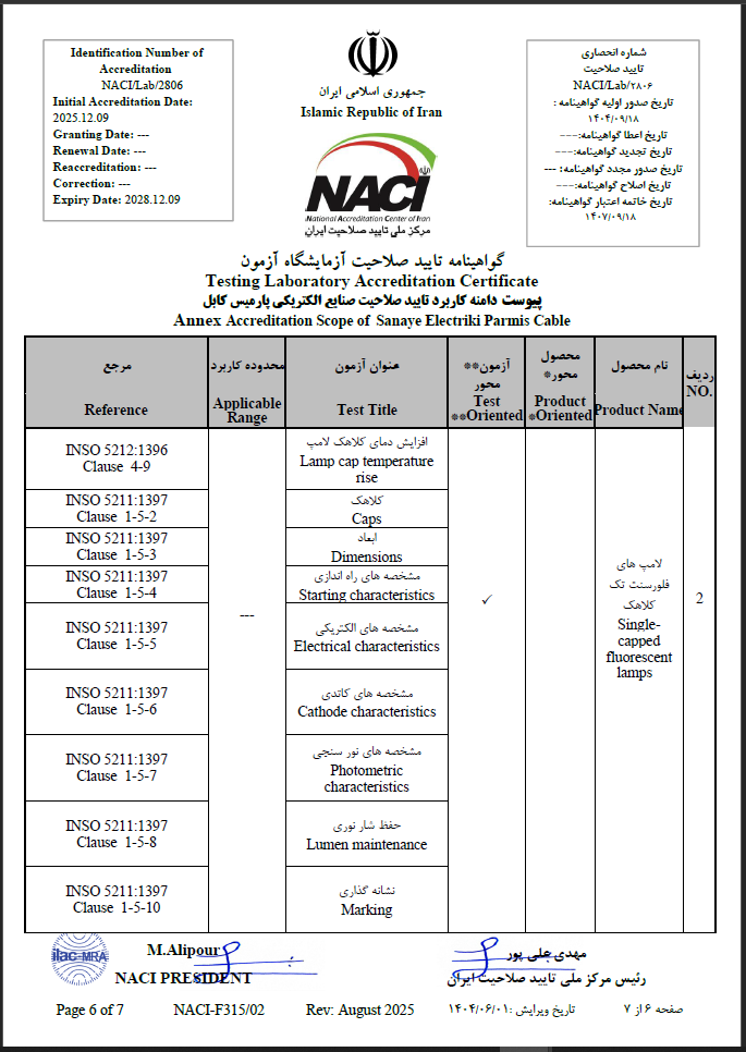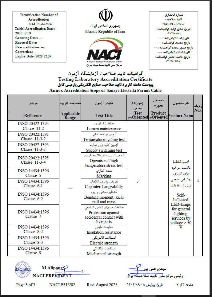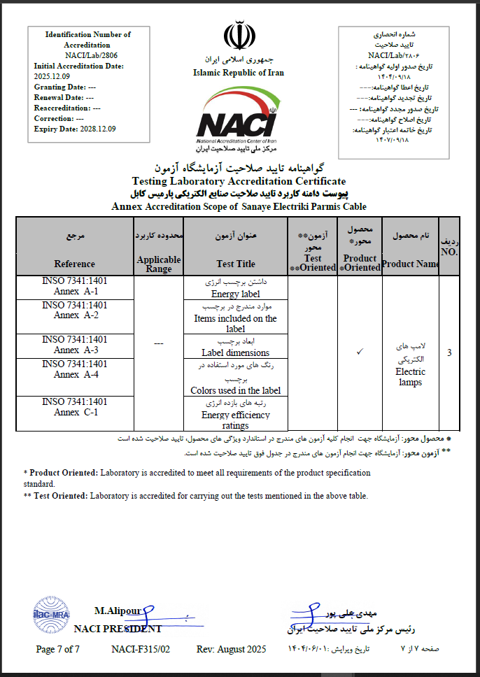 ارزیابی آزمایشگاه صنایع الکتریکی پارمیس کابل بر اساس الزامات استاندارد "17025 " در سال 1404 توسط مرکز ملی تایید صلاحیت ایران انجام شد و با توجه به نتیجه بدست آمده موفق به اعطا گواهینامه شد.
